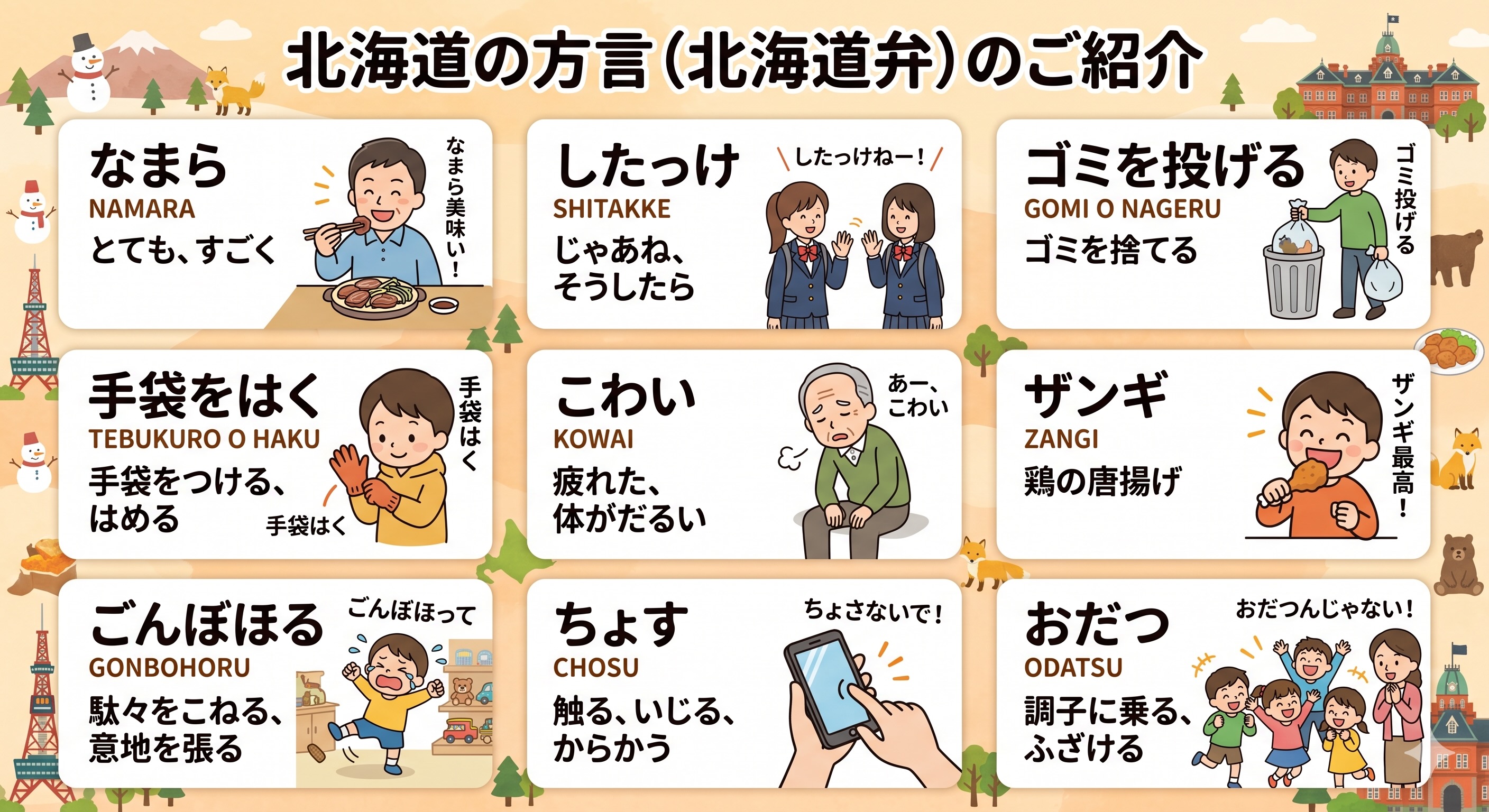 全体的なイントネーションは標準語に近いものの、日常会話に溶け込んでいる独特の単語や言い回しが数多く存在します。本記事では、旅行や出張、あるいは北海道出身の方との会話で役立つ、代表的な北海道弁をご紹介します。
